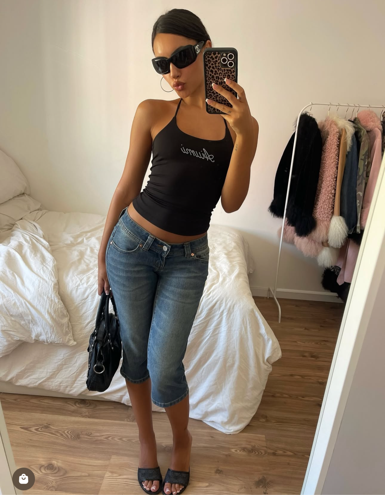 - Vanessa is wearing the Aiumi Halter in Black in size S.