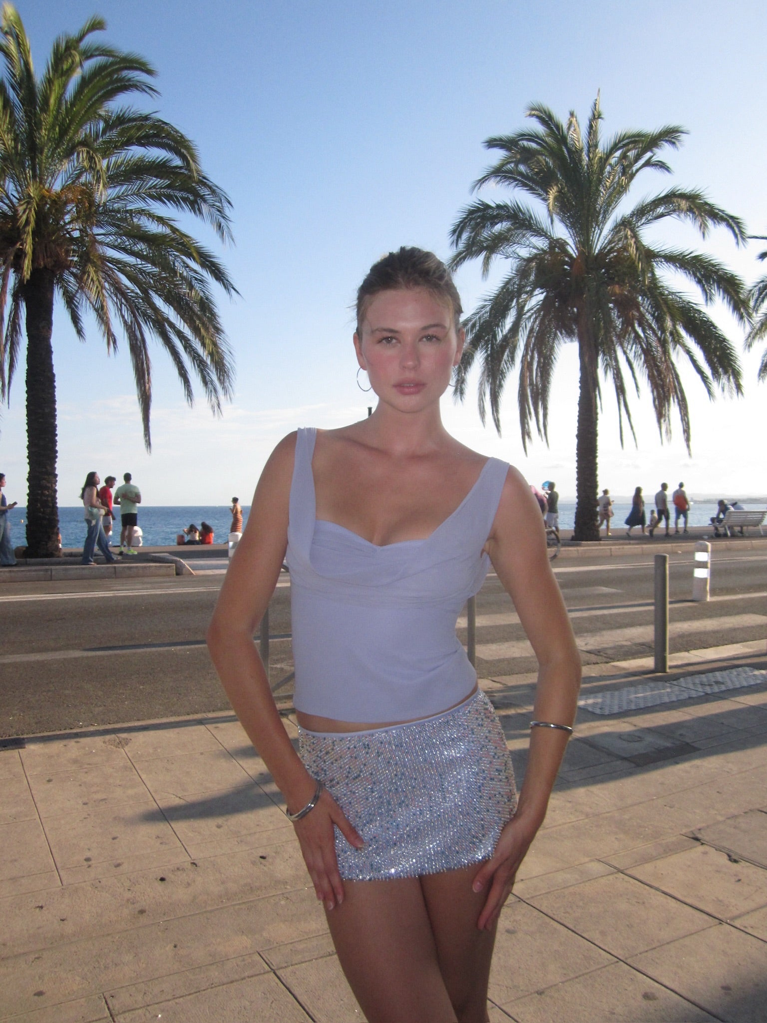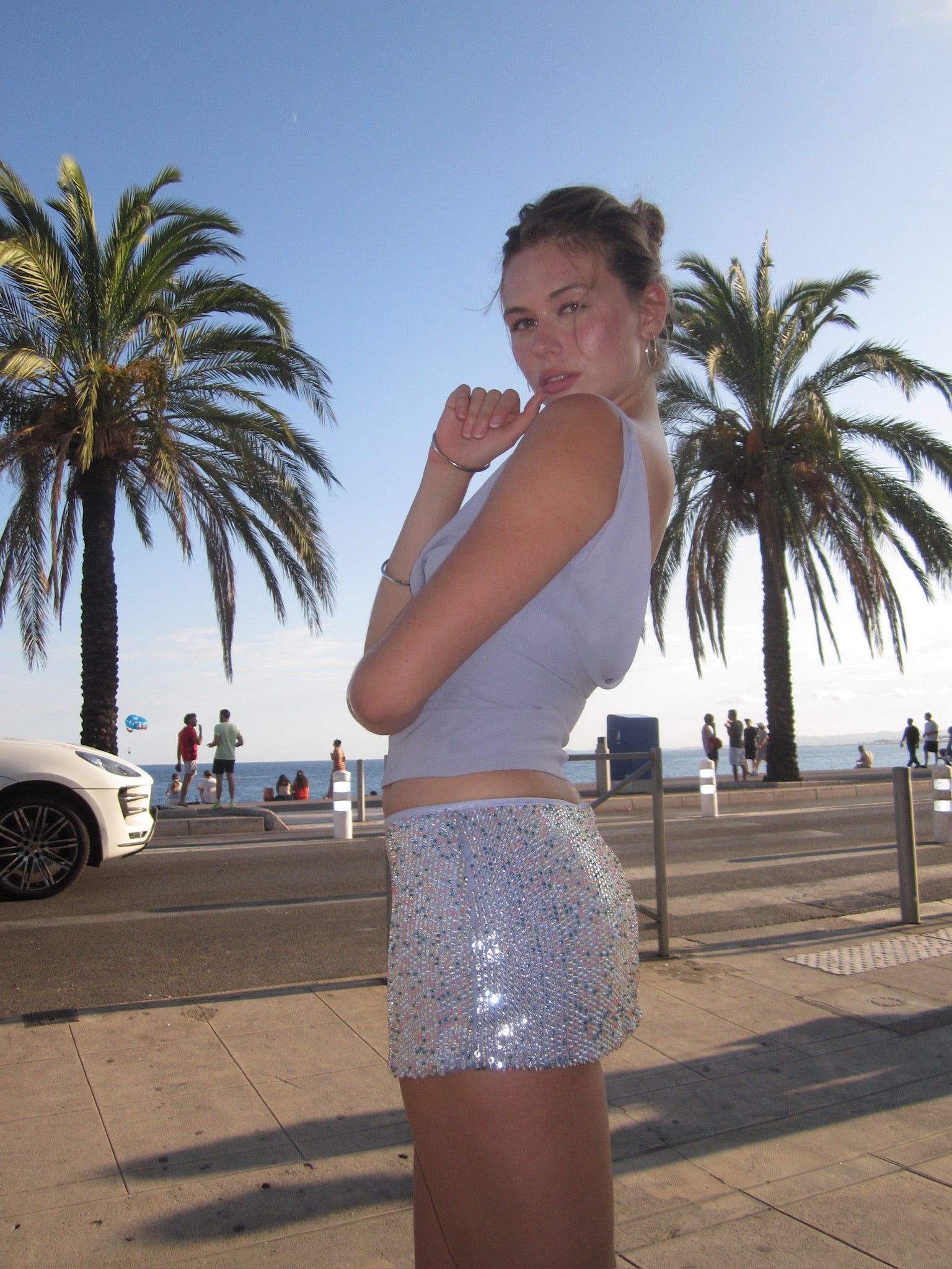 Ize top and bralette in a corset-style top features a softly draped neckline with twisted detailing, with a draped bralette. Paired with our hand beaded sequin mini skirt, this look captures light with every movement.